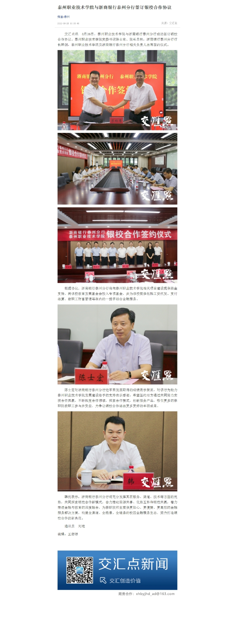 2022年8月26日交汇点:泰州职业技术学院与浙商银行泰州分行签订银校合作协议