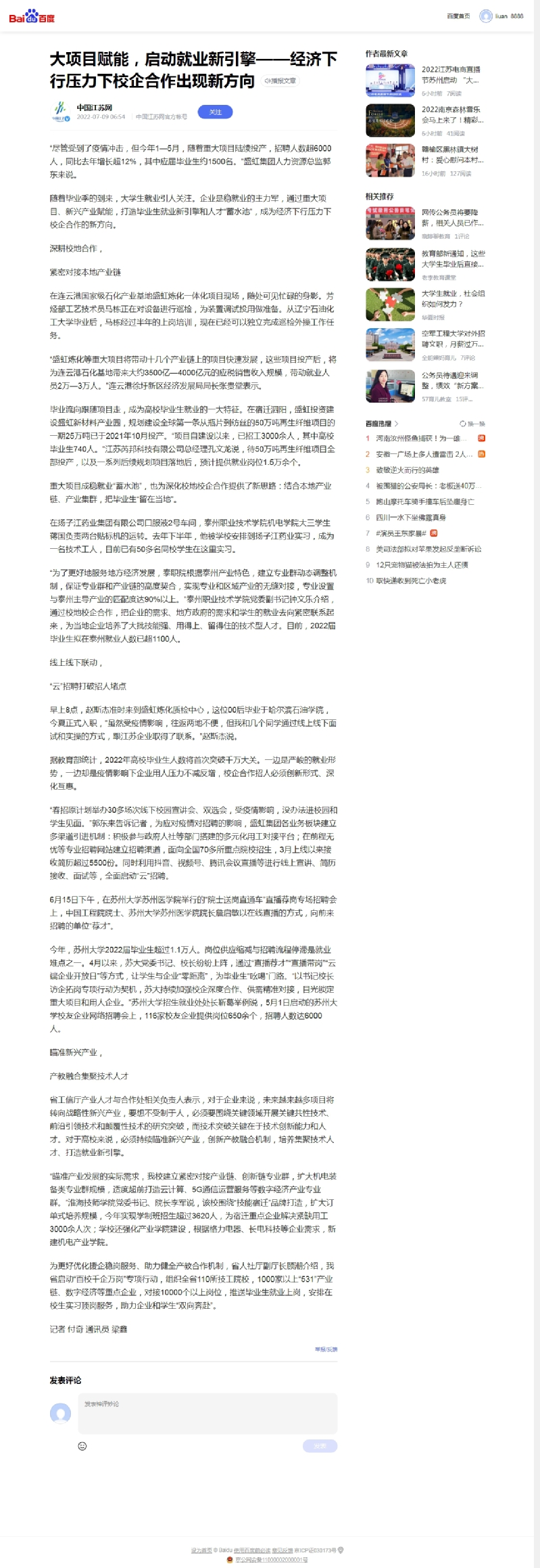 2022年7月9日中国江苏网:大项目赋能,启动就业新引擎——经济下行压力下校企合作出现新方向