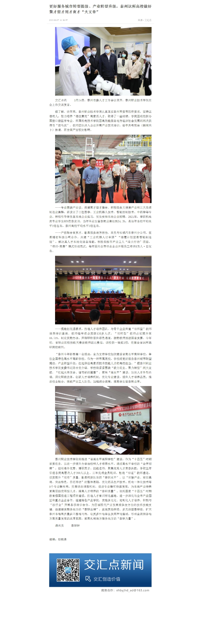 2022年3月27日交汇点:更好服务城市转型提级、产业转型升级,泰州这所高校做好聚才留才用才育才“大文章”