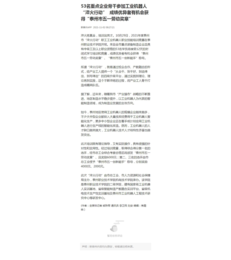 2021年11月2日新泰州:53名重点企业骨干参加工业机器人“淬火行动” 成绩优异者有机会获得“泰州市五一劳动奖章”