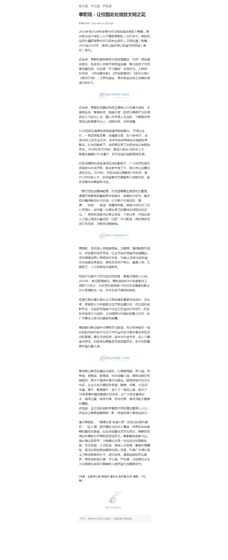 2021年9月15日新泰州:泰职院:让校园处处绽放文明之花
