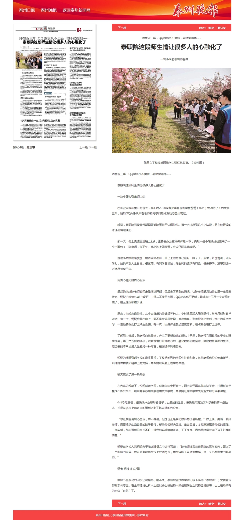 2021年9月14日泰州晚报:泰职院这段师生情让很多人的心融化了