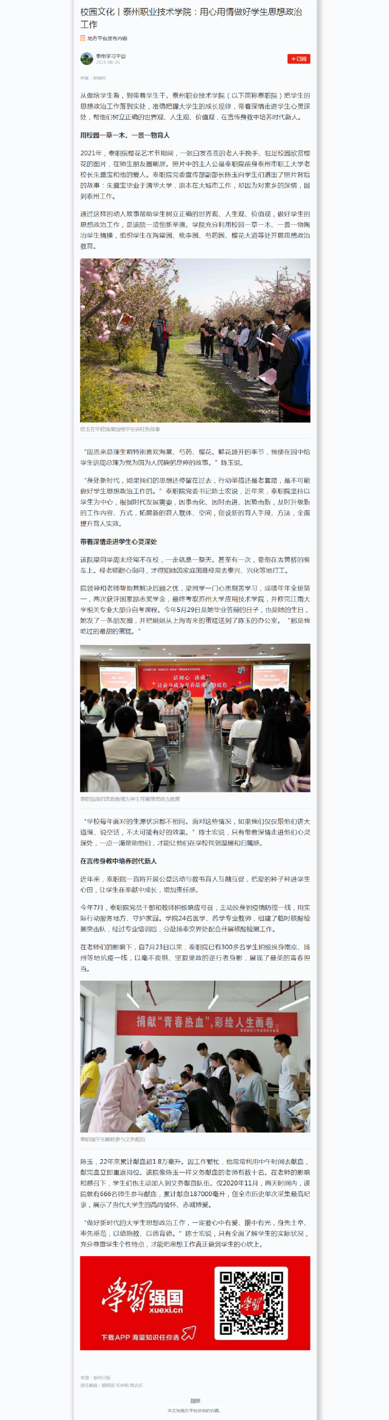 2021年8月26日学习强国:校园文化丨泰州职业技术学院:用心用情做好学生思想政治工作
