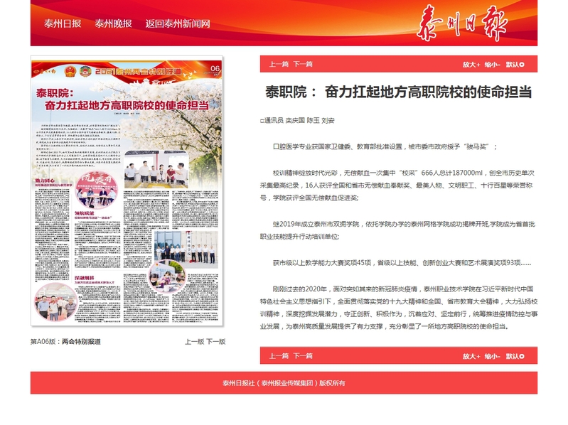 2021年1月20日泰州日报:泰职院: 奋力扛起地方高职院校的使命担当
