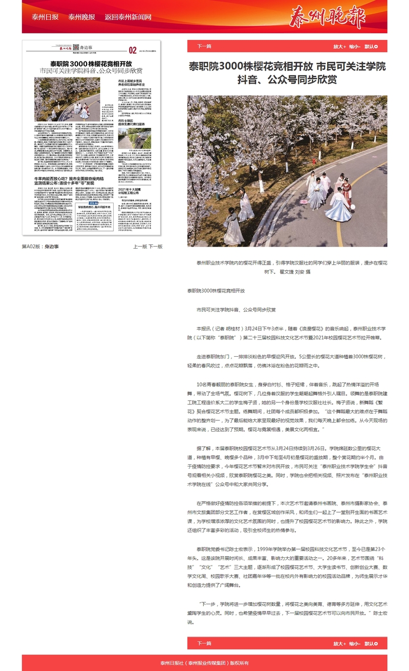 2021年3月26日泰州晚报:泰职院3000株樱花竞相开放 市民可关注学院抖音、公众号同步欣赏