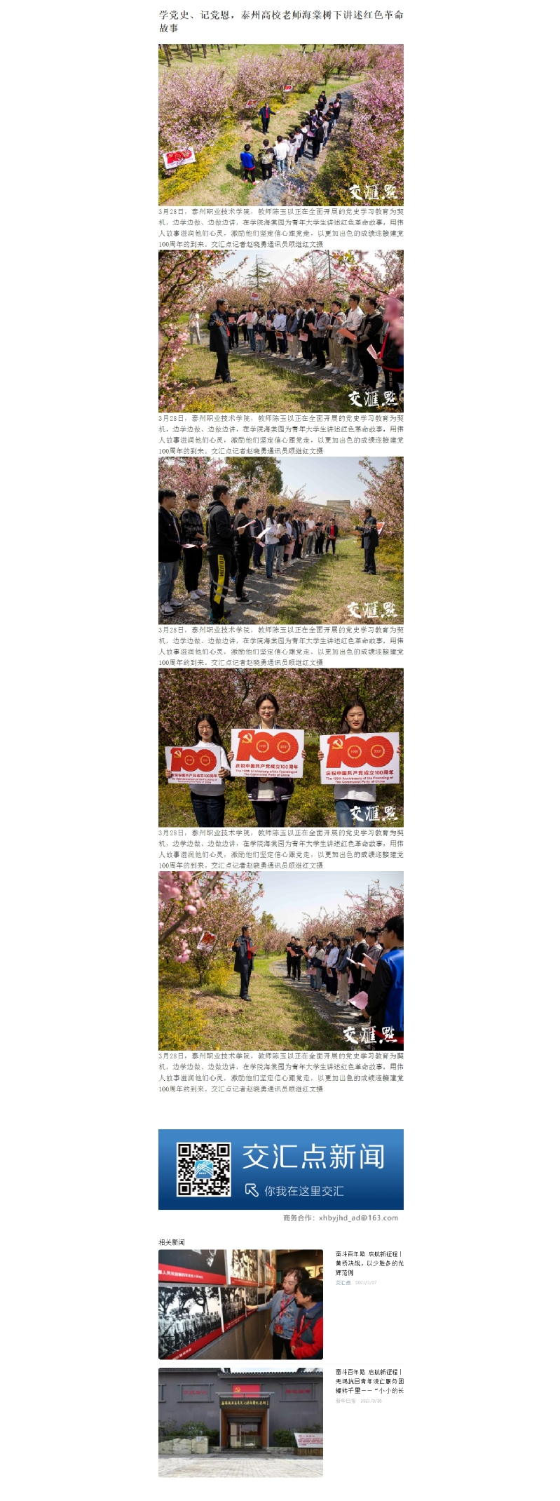 2021年3月28日交汇点:学党史、记党恩,泰州高校老师海棠树下讲述红色革命故事