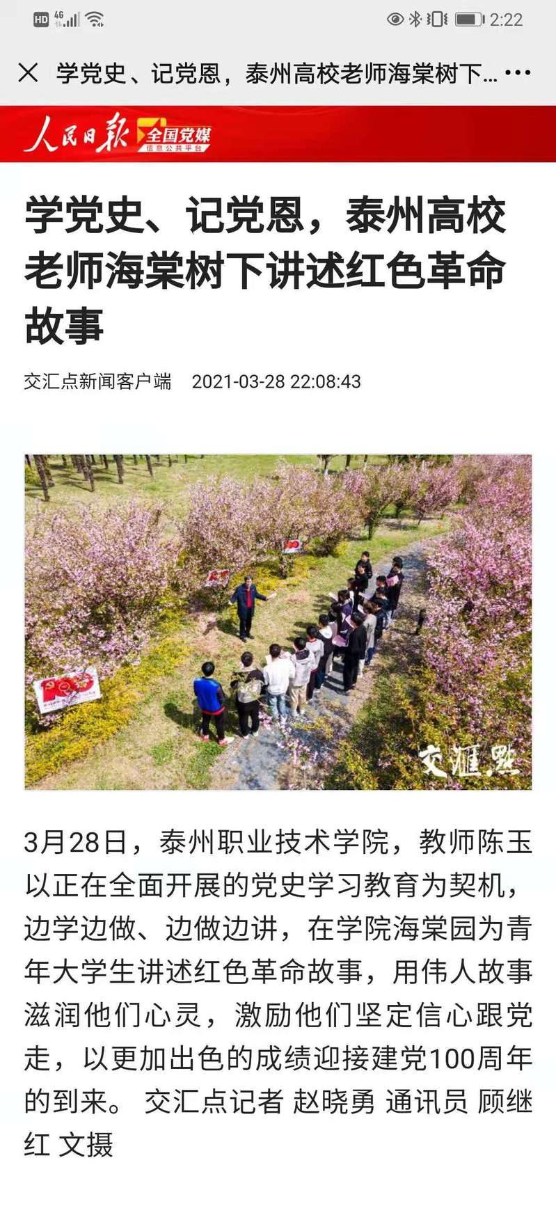 2021年3月28日人民日报全国党媒:学党史、记党恩,泰州高校老师海棠树下讲述红色革命故事
