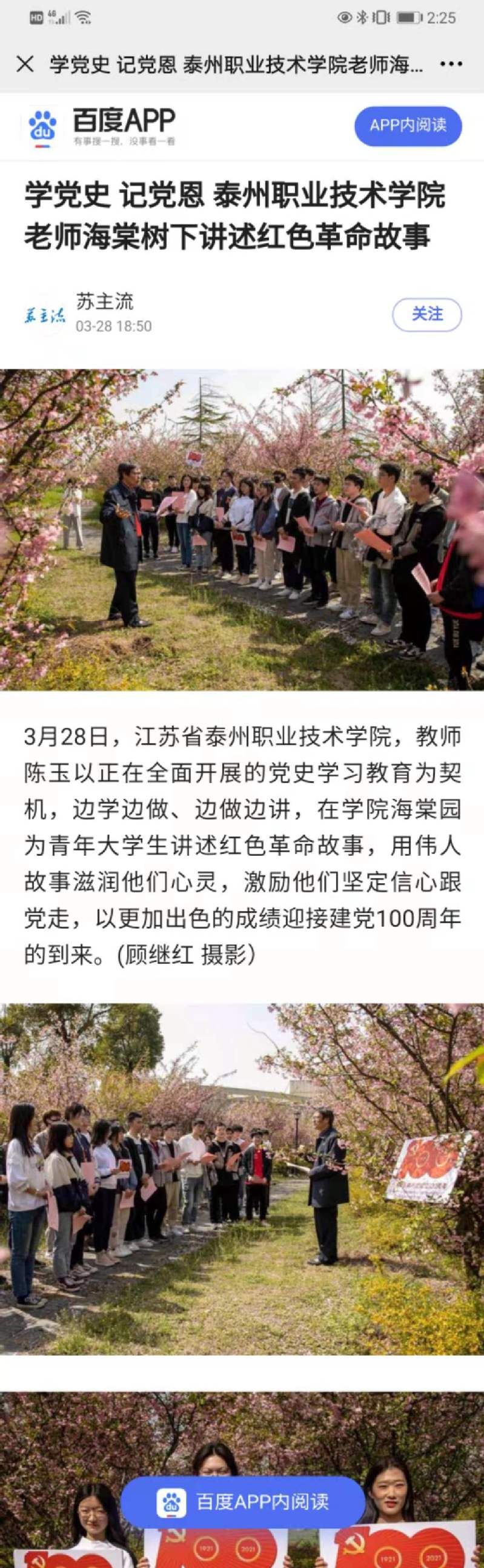 2021年3月28日苏主流:学党史 记党恩 泰州职业技术学院老师海棠树下讲述红色革命故事