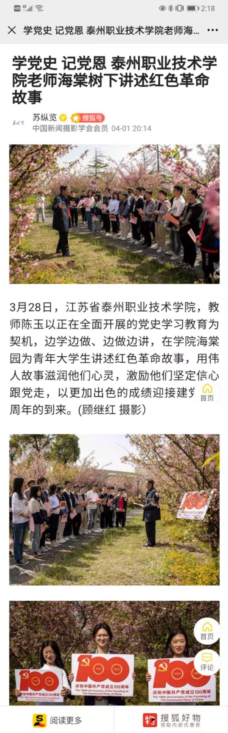 2021年3月28日苏纵览:学党史 记党恩 泰州职业技术学院老师海棠树下讲述红色革命故事
