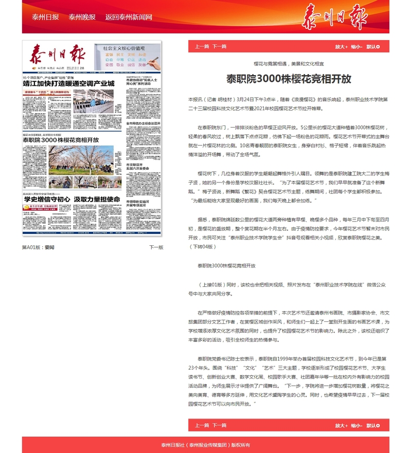 2021年3月28日泰州日报:泰职院3000株樱花竞相开放