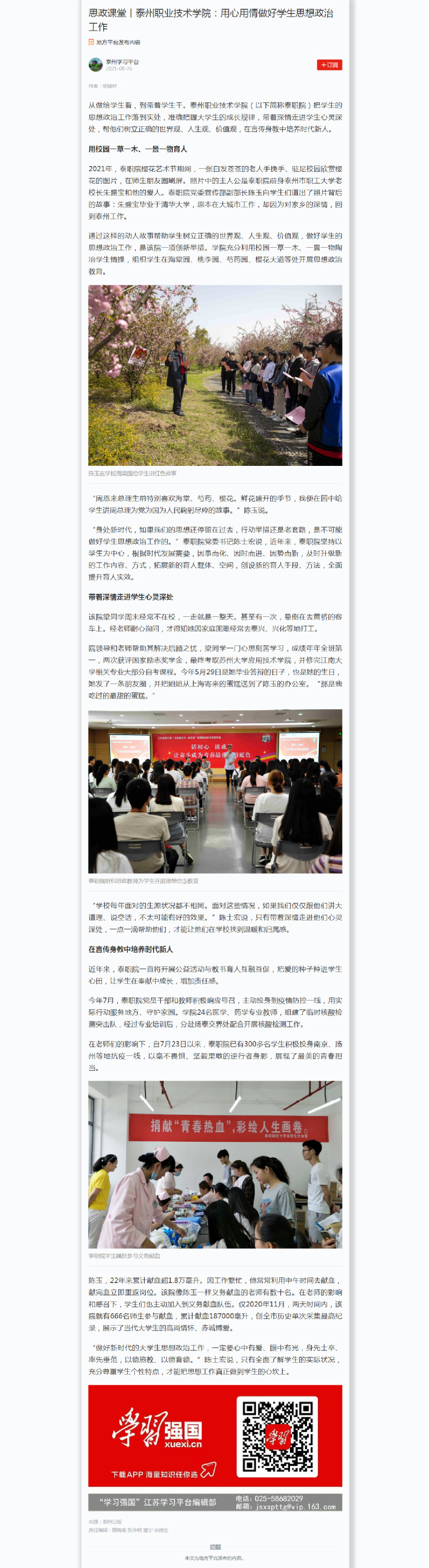 2021年8月26日学习强国:思政课堂丨泰州职业技术学院:用心用情做好学生思想政治工作