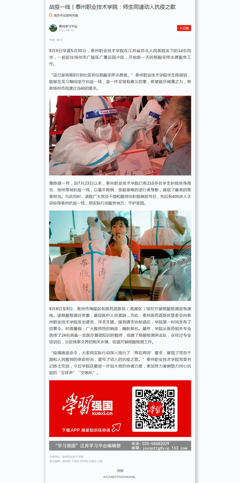 2021年8月10日学习强国:战疫一线丨泰州职业技术学院:师生同谱动人抗疫之歌