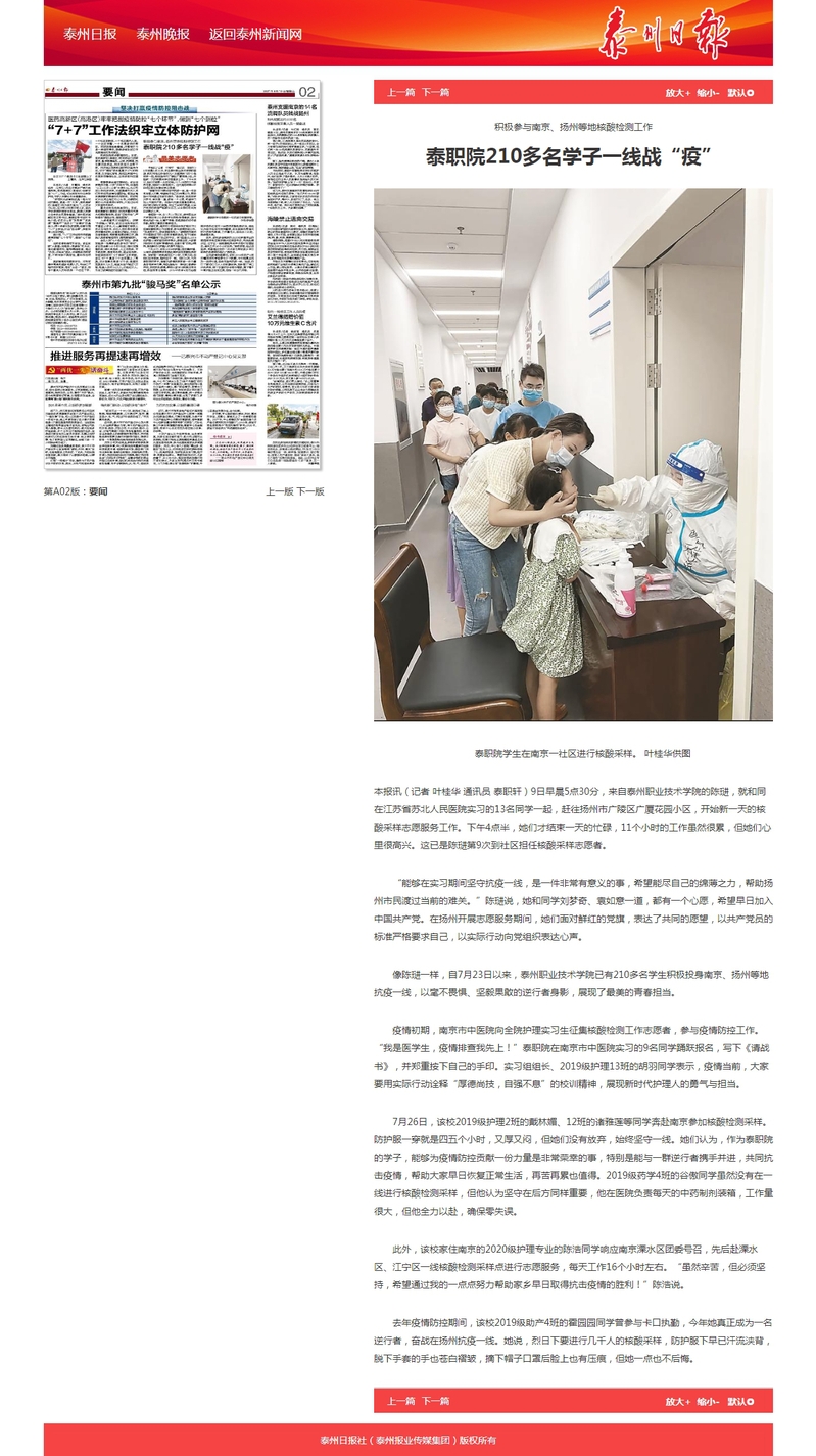 2021年8月10日泰州日报:泰职院210多名学子一线战“疫”