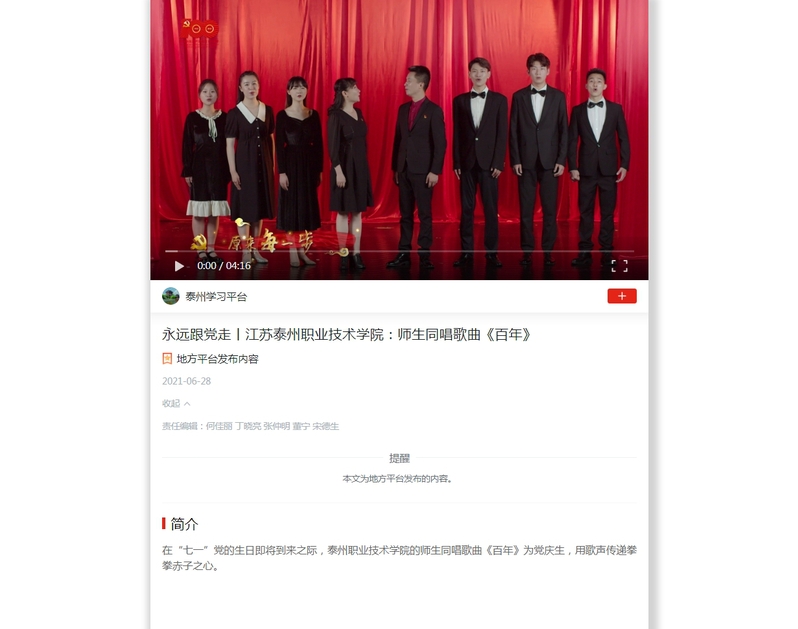 2021年6月28日学习强国:永远跟党走丨江苏泰州职业技术学院:师生同唱歌曲《百年》