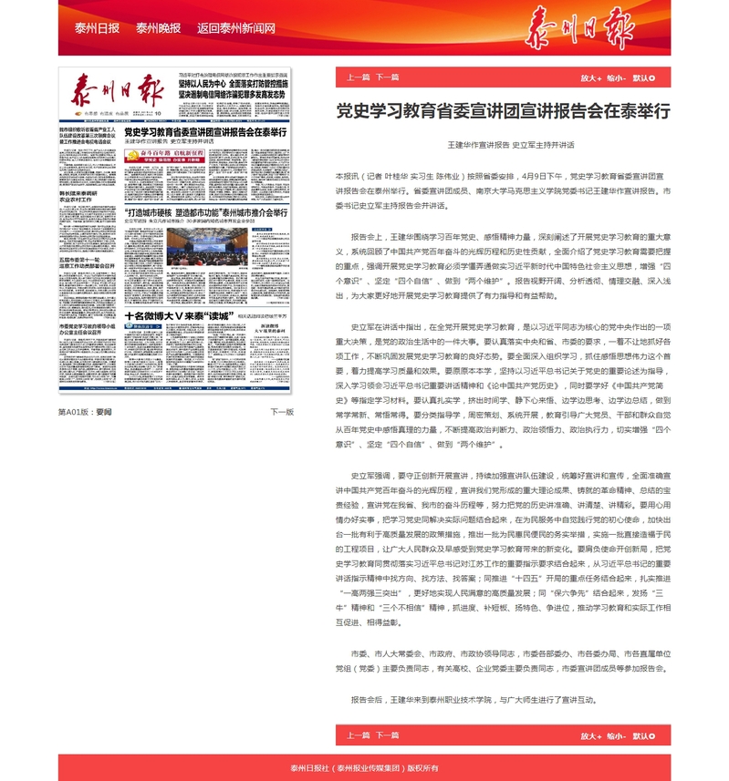 2021年4月10日泰州日报:党史学习教育省委宣讲团宣讲报告会在泰举行