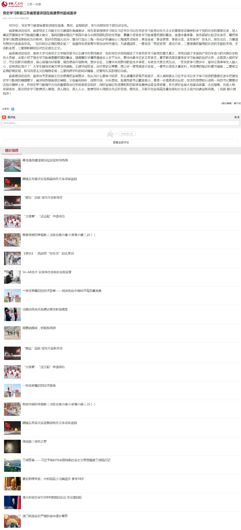 2021年4月11日人民网:党史学习教育江苏省委宣讲团在南通泰州盐城宣讲