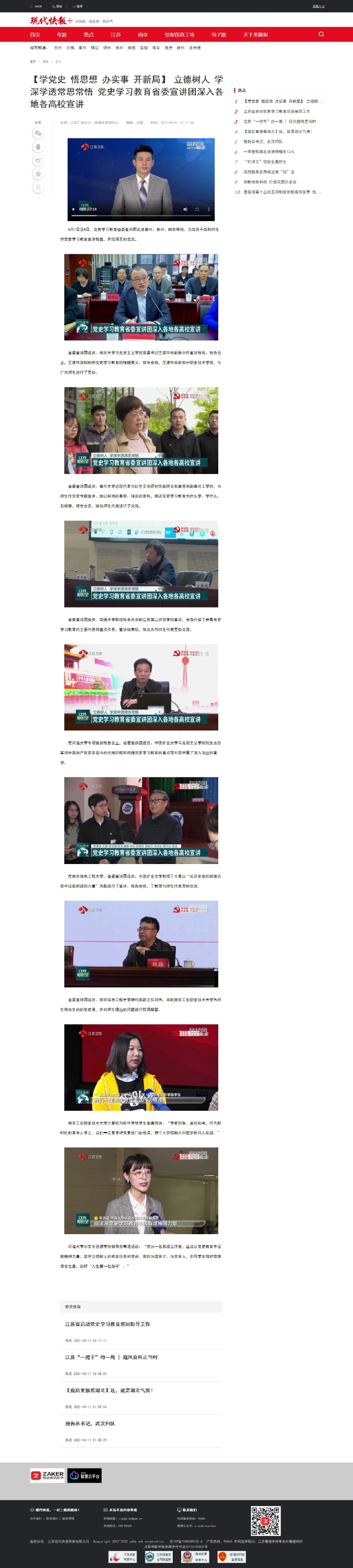 2021年4月11日现代快报网:【学党史 悟思想 办实事 开新局】 立德树人 学深学透常思常悟 党史学习教育省委宣讲团深入各地各高校