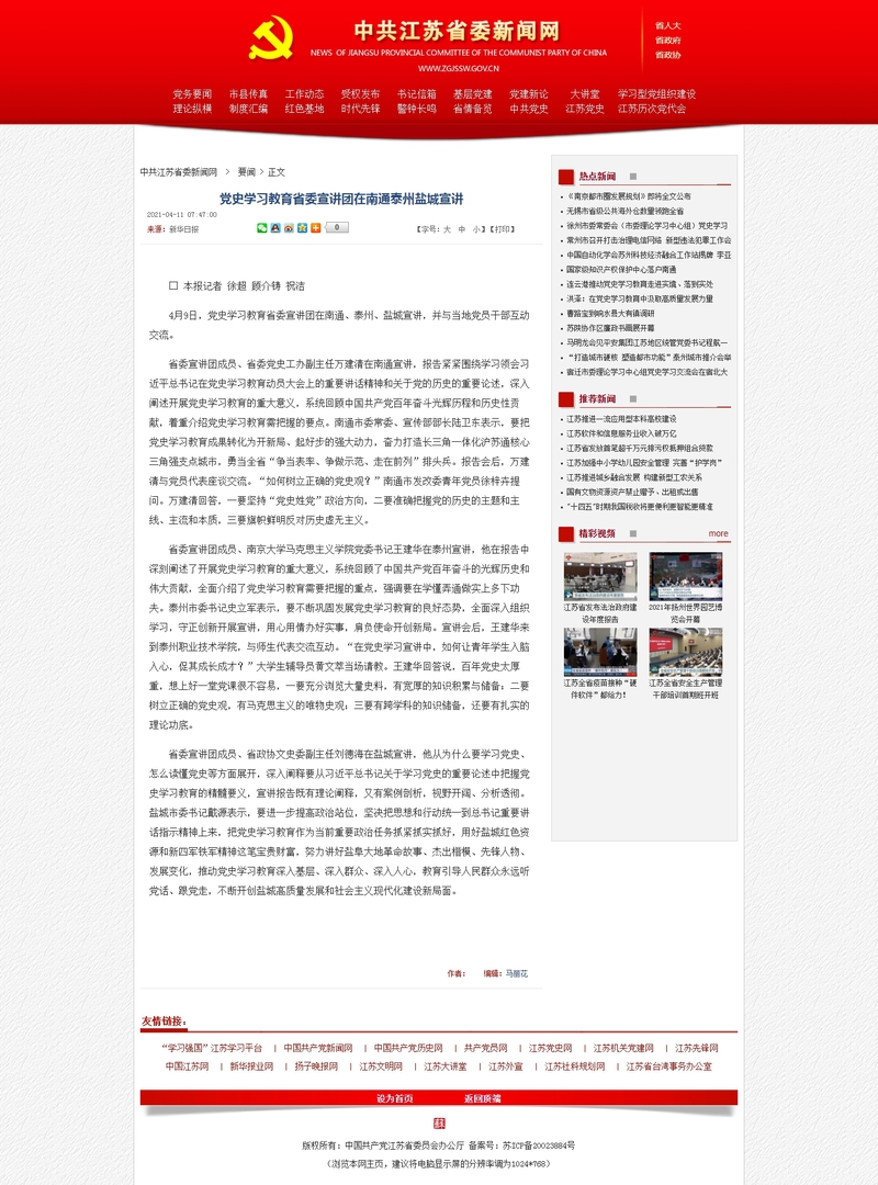 2021年4月11日中共江苏省委新闻网:党史学习教育省委宣讲团在南通泰州盐城宣讲
