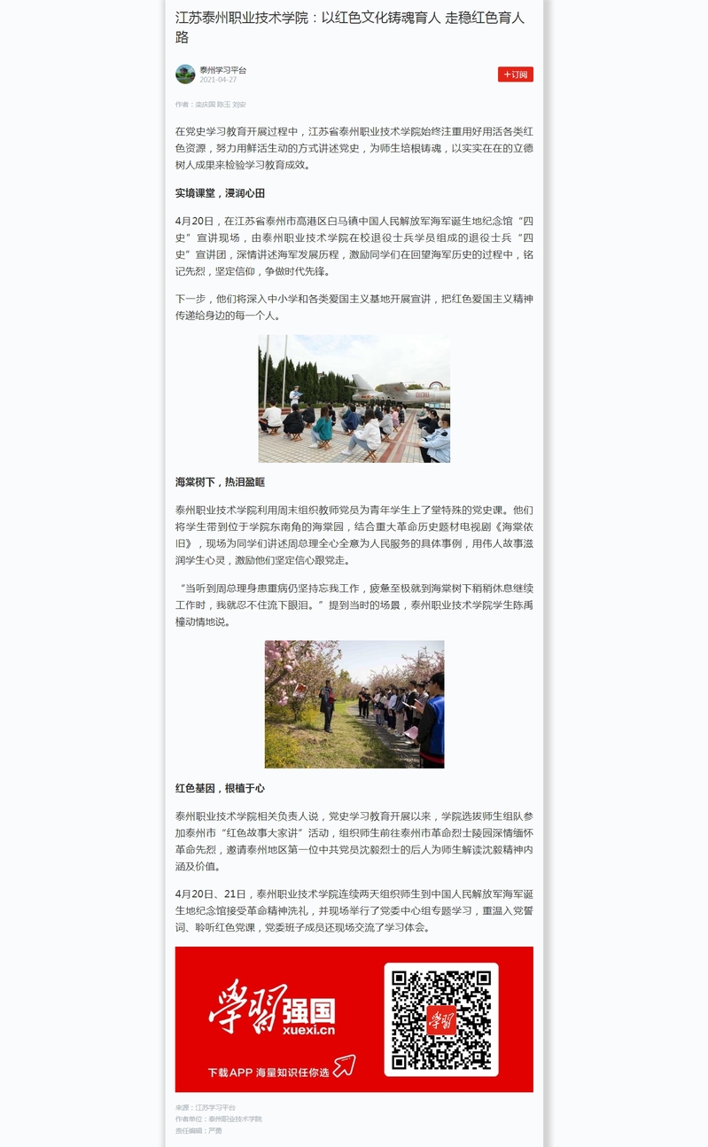 2021年4月27日学习强国:江苏泰州职业技术学院:以红色文化铸魂育人 走稳红色育人路