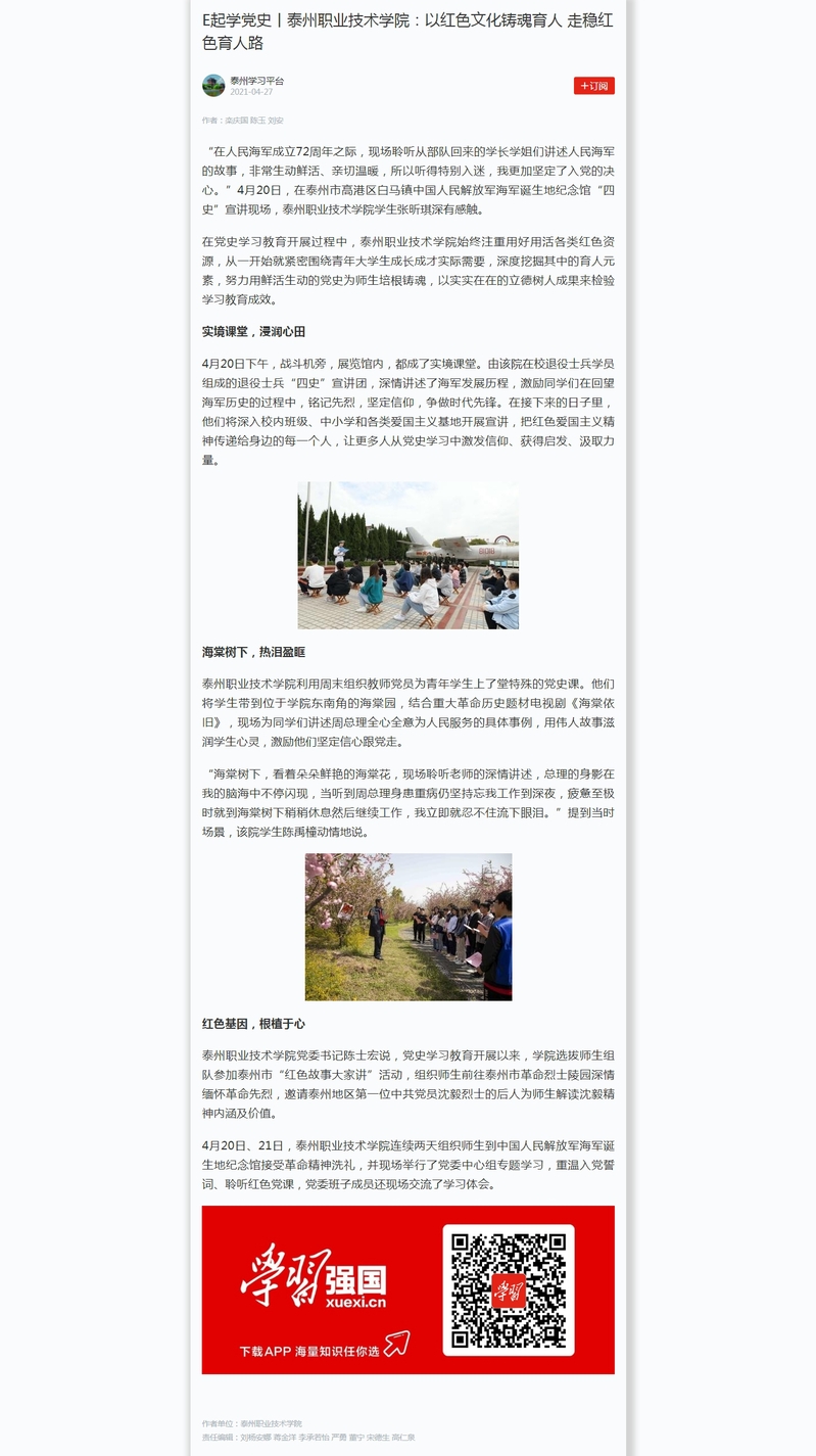2021年4月27日学习强国:E起学党史丨泰州职业技术学院:以红色文化铸魂育人 走稳红色育人路