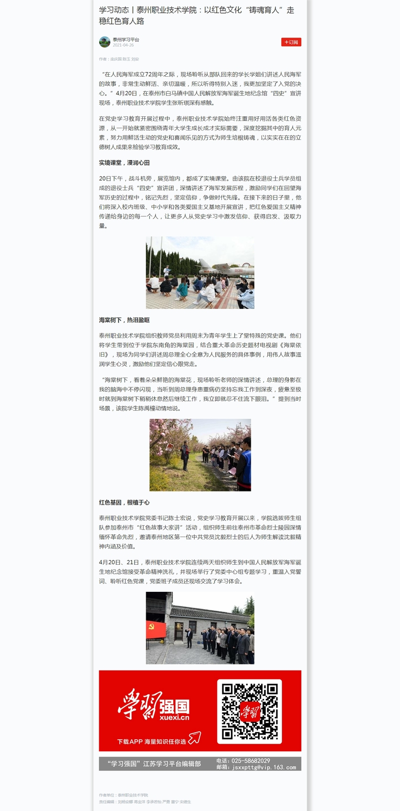2021年4月26日学习强国:学习动态丨泰州职业技术学院:以红色文化“铸魂育人” 走稳红色育人路