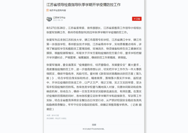 2022年8月29日学习强国:江苏省领导检查指导秋季学期开学疫情防控工作