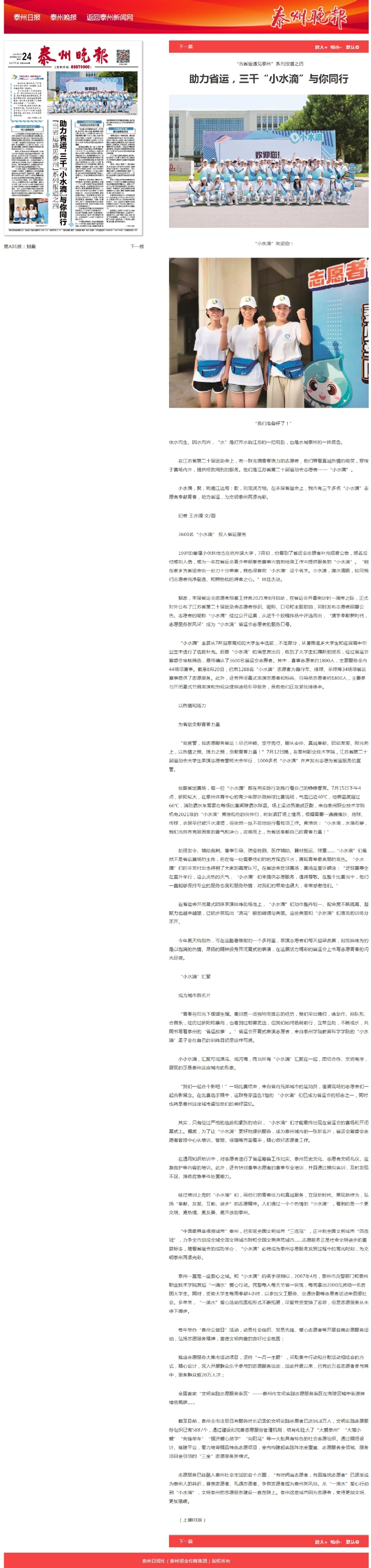 2022年8月24日泰州晚报:助力省运,三千“小水滴”与你同行