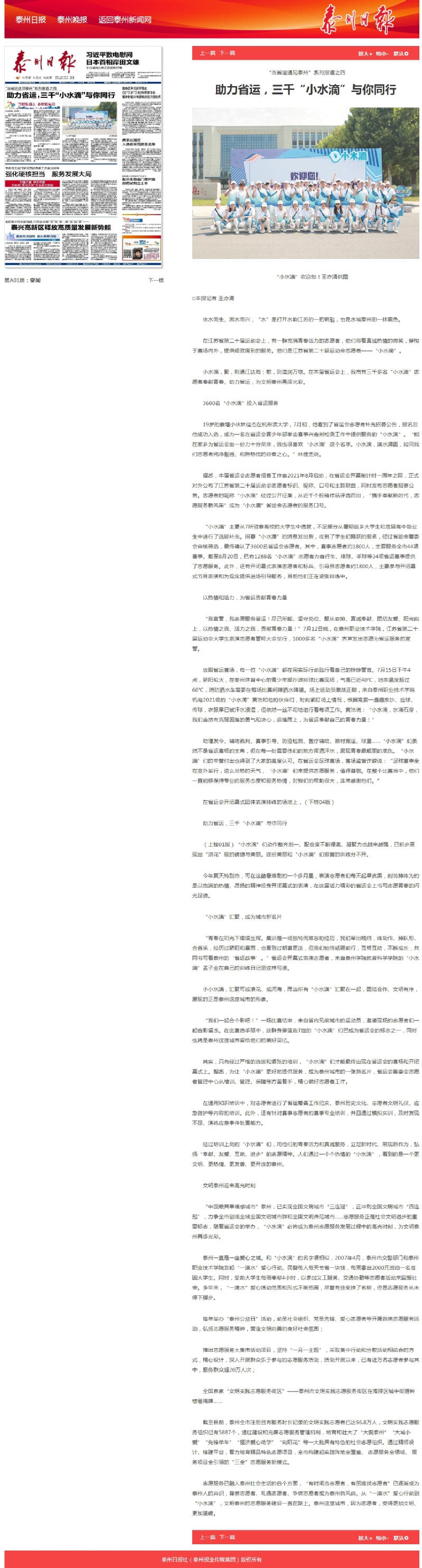 2022年8月23日泰州日报:助力省运,三千“小水滴”与你同行