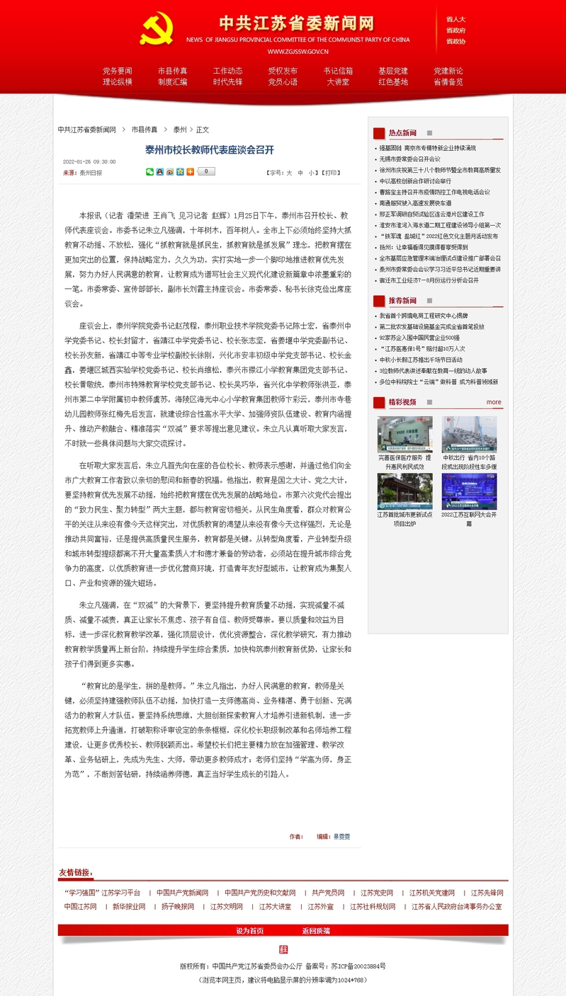 2022年1月26日中共江苏省委新闻网:泰州市校长教师代表座谈会召开
