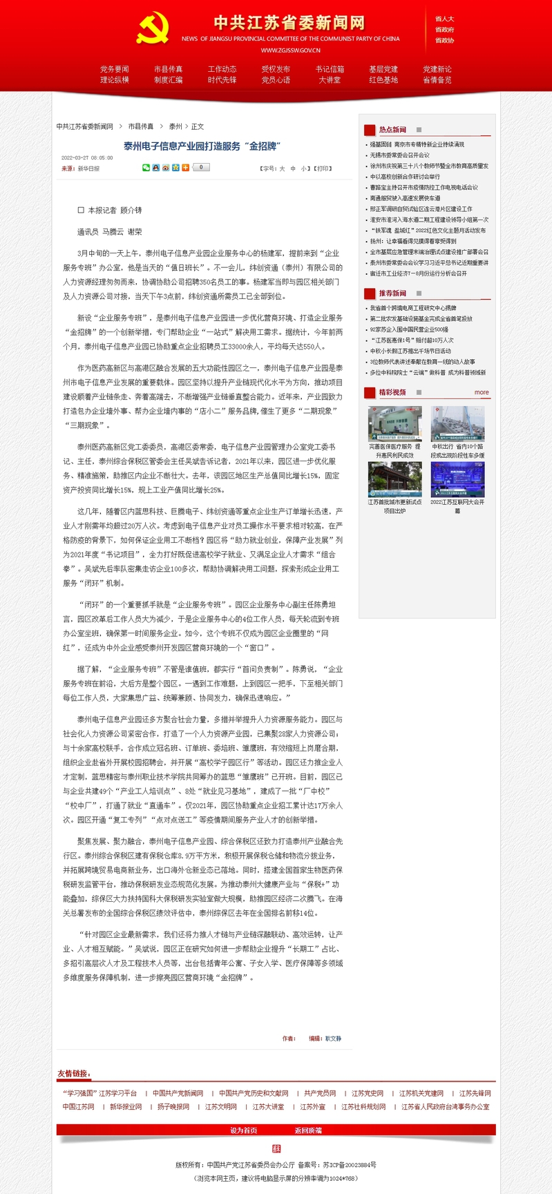 2022年3月27日中共江苏省委新闻网:泰州电子信息产业园打造服务“金招牌”