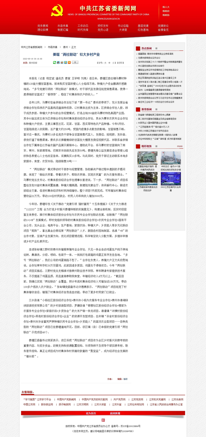 2022年5月19日中共江苏省委新闻网:姜堰“两社联动”壮大乡村产业