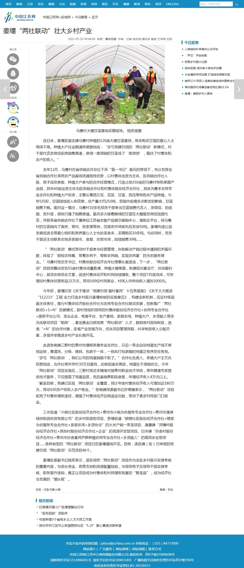 2022年5月19日中国江苏网:姜堰“两社联动”壮大乡村产业