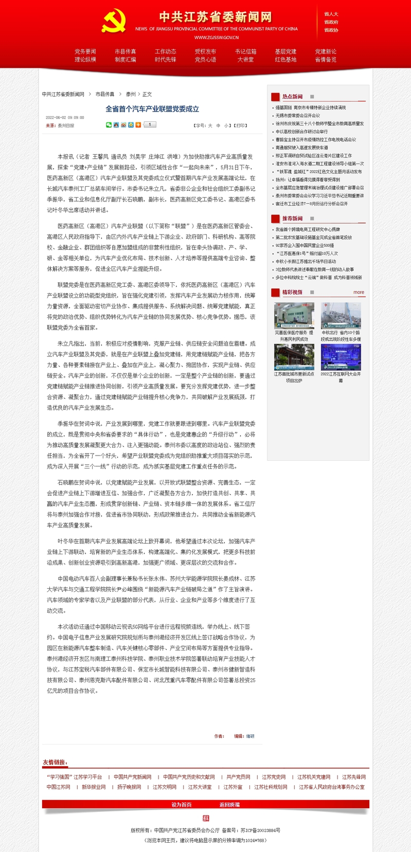 2022年6月2日中共江苏省委新闻网:全省首个汽车产业联盟党委成立