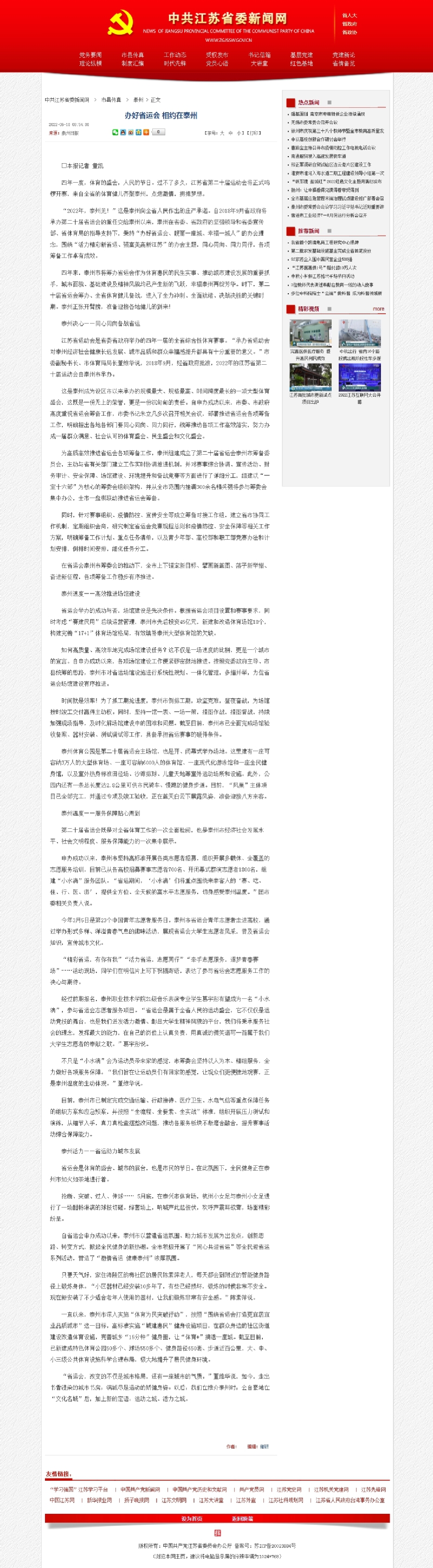 2022年6月10日中共江苏省委新闻网:办好省运会 相约在泰州