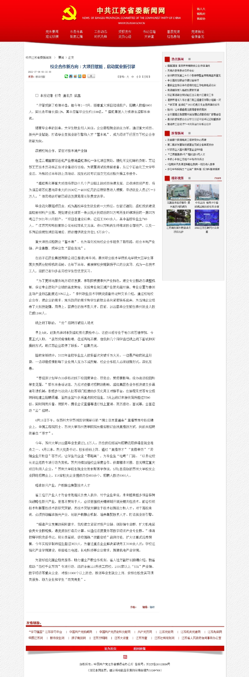 2022年7月9日中共江苏省委新闻网:校企合作新方向:大项目赋能,启动就业新引擎