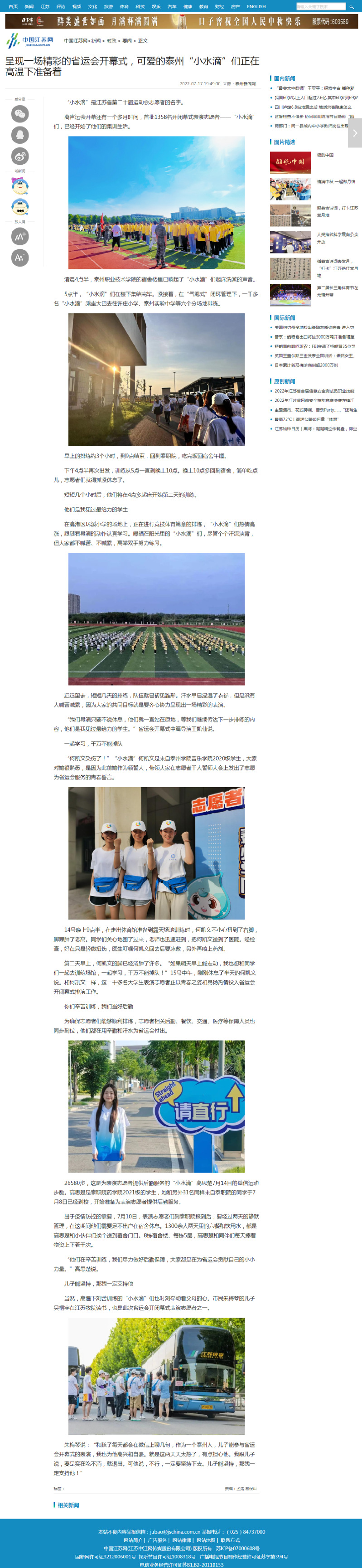2022年7月17日中国江苏网:呈现一场精彩的省运会开幕式,可爱的泰州“小水滴”们正在高温下准备着