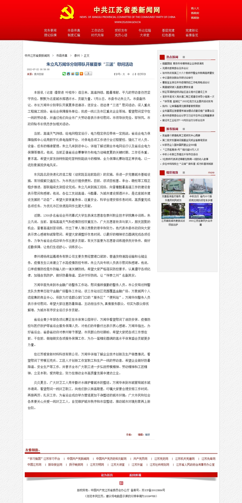 2022年7月22日中共江苏省委新闻网:朱立凡万闻华分别带队开展夏季“三送”慰问活动