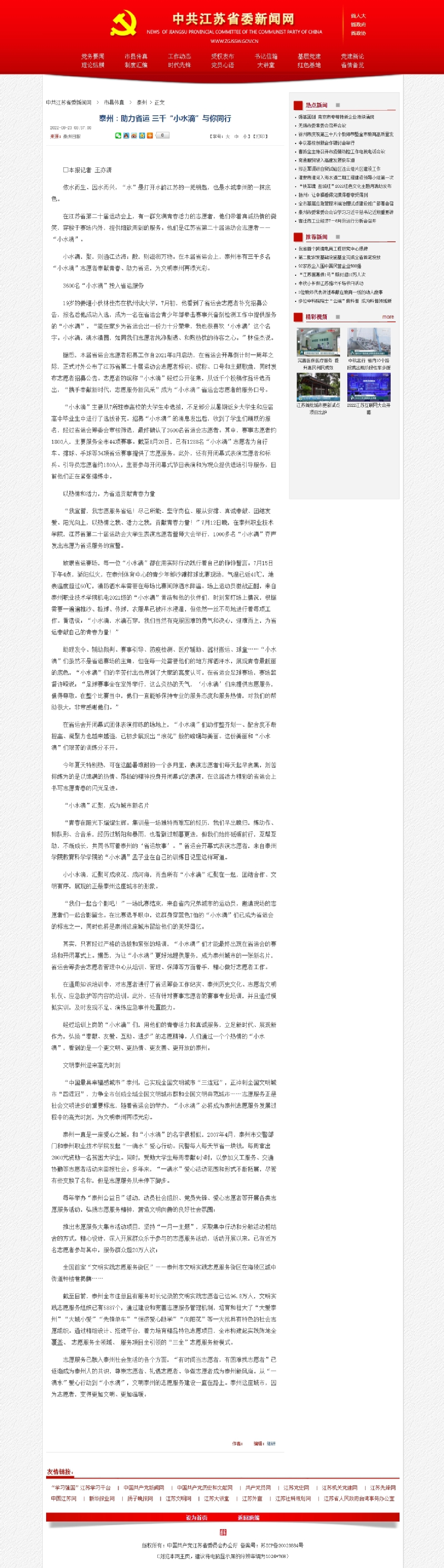 2022年8月23日中共江苏省委新闻网:泰州:助力省运 三千“小水滴”与你同行