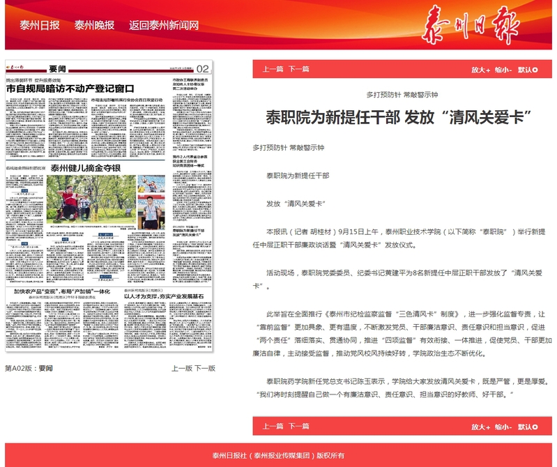 2022年9月19日泰州日报:泰职院为新提任干部 发放“清风关爱卡”