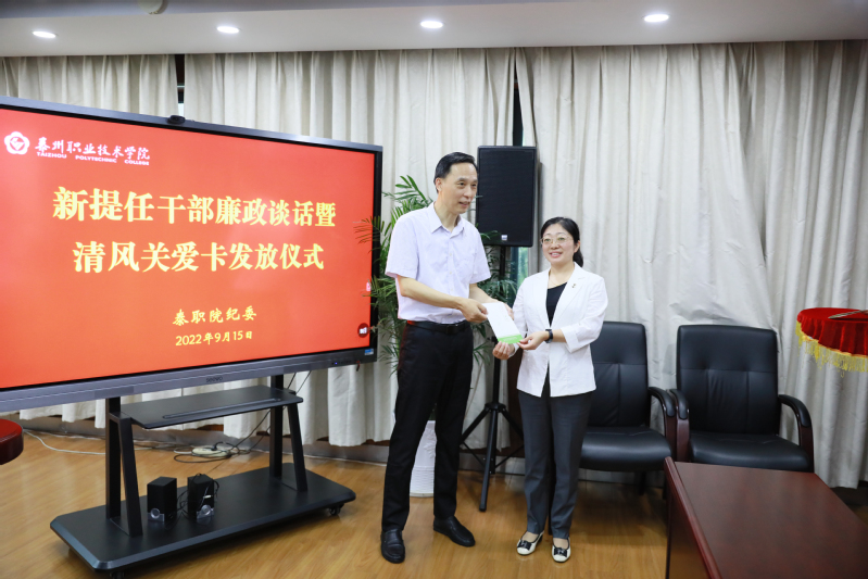 药学院新任党总支书记陈玉表示,学院给大家发放清风关爱卡,既是严管,更是厚爱。“我们将时刻提醒自己做一个有廉洁意识、责任意识、担当意识的好教师、好干部。”