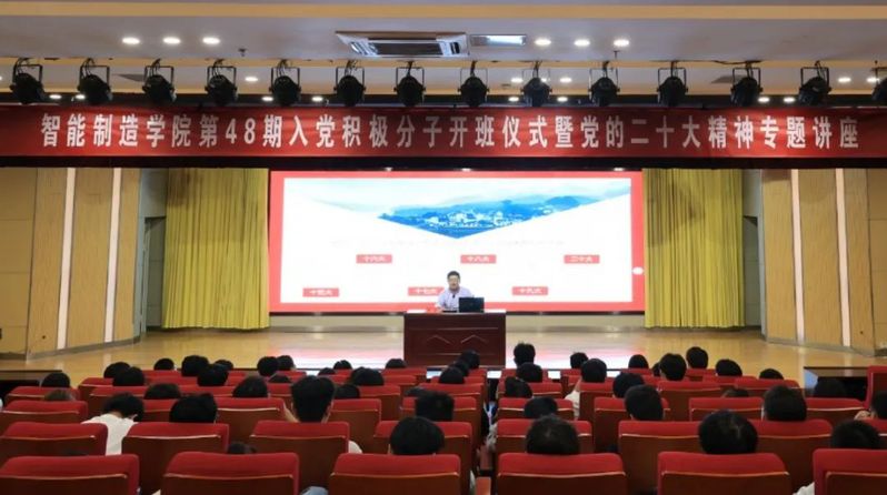为深入学习贯彻党的二十大精神和习近平新时代中国特色社会主义思想,进一步加强对入党积极分子的思想教育,严格落实党员发展工作质量。5月16日晚,智能制造学院在校大学生活动中心报告厅举行第48期入党积极分子开班仪式。智能制造学院党总支书记严杰出席开班仪式并作学习贯彻党的二十大精神专题讲座。