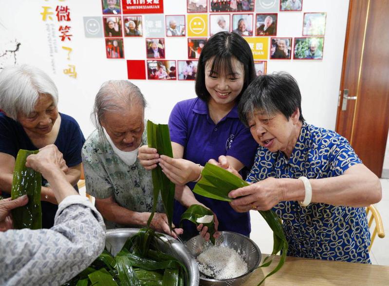裹粽子,暖人心。为了献上挚诚的端午祝福,经管院提前一天组织了采摘活动,同学们在汗水中体验了劳动的趣味和辛苦,同时也收获了满满的劳动果实——一捆捆粽叶。活动现场,同学们带去了亲手采摘的粽叶,跟福利院的老人们一道包起了粽子。“00后”的学生普遍不会包,老人们就现场教学,一边教、一边学、一边做,现场欢声笑语,节日氛围浓厚。