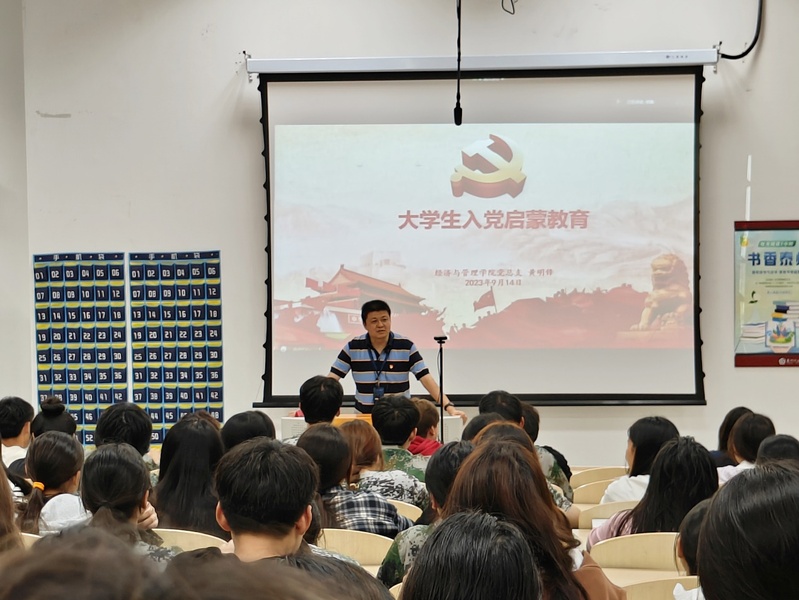 9月14日晚19:00,经管院开学第一课活动在校公共教学楼如期开课。党总支黄明锋书记为同学们做了入党启蒙教育。他指出,党和国家历来重视青年一代的成长,当代大学生应该积极加入中国共产党。课堂上,全体同学一起重温了习近平总书记对广大青年的谆谆嘱托:坚定不移听党话、跟党走,怀抱梦想又脚踏实地,敢想敢为又善作善成,立志做有理想、敢担当、能吃苦、肯奋斗的新时代好青年,让青春在全面建设社会主义现代化国家的火热实践中绽放绚丽之花。韩翔院长介绍了经济管理学院的基本情况和办学特色,并且巧妙拆解了大学生三个字的含义:大是岁数增长,成年的责任;学是学知识、学技术、学做人;生是做好职业生涯规划、过好大学生活。