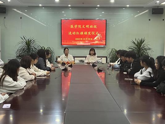 10月25日晚,医学院首次“文明班级流动红旗“授旗仪式在医学楼801举行,医学院党总支副书记张丽、辅导员和22、23级全体班长参与本次授旗仪式。