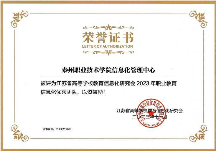 根据《关于开展江苏省高等学校教育信息化研究会2023年专业委员会优秀团队、优秀个人评选的通知》(苏高教信研〔2023〕7号)文件精神,经单位申报、专委会评审、研究会审核,我校信息化管理中心获评江苏省高等学校教育信息化研究会2023年职业教育信息化优秀团队。