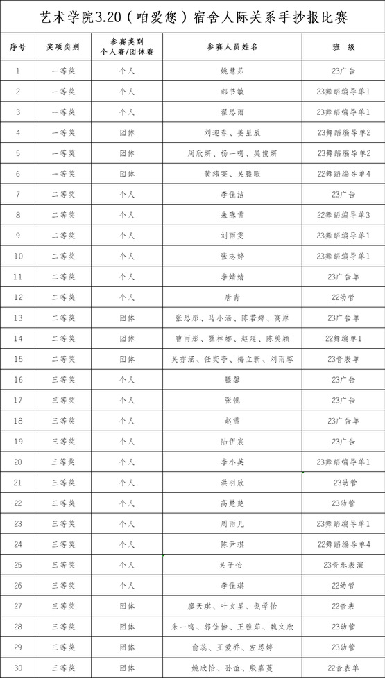 在这次手抄报大赛中,同学们积极参与,围绕“宿舍人际关系”主题,发挥各自的才华,设计出了十分优秀的作品,形式多样,内容丰富。除此以外,本次手抄报比赛接受团体报名,同学们在交流与互动中,更加明白了合作的内涵,并且也增强了同学们的宿舍集体感和荣誉感,推动了宿舍健康与和谐的建设。同学们用自己的方式,用纸和笔表达了对和谐宿舍生活的向往和追求。此次手抄报比赛共收到作品30幅,经过评审团评审,评出一等奖6项、二等奖9项、三等奖15项。