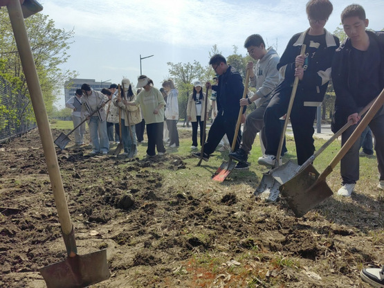 同学们自行分成几个小组,轮流体验耕作。他们用锄头和筢子将土壤表层的杂草清理干净,再用铁锹将土层分成一个个的小土块,最后将大的土块砸碎,就这样达到了除杂草、松土壤目的。将土壤松散,赋予贫瘠的土地以营养是植株良好发芽、茁壮成长的前提。松土结束后,同学们拿出了三袋营养土,均匀地铺在了土壤上面,并用筢子把两种土混匀。之后的刨坑、播种、掩埋一系列流程都在同学们不断高涨的兴致中有序完成。活动最后,老师和同学们轮流地对种子浇水,将半天的辛劳浇灌在了种子上。