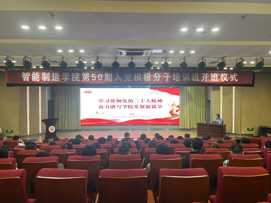 为深入学习贯彻习近平新时代中国特色社会主义思想,切实提高入党积极分子的理论水平和政治素养,从源头上把好党员“入口关”,5月6日晚,智能制造学院在大学生活动中心报告厅举行第50期入党积极分子培训班开班仪式暨党的二十大精神专题讲座,校党委学工部部长、智能制造学院党总支书记严杰,辅导员陈丽,第50期入党积极分子以及学生干部代表参加活动。
