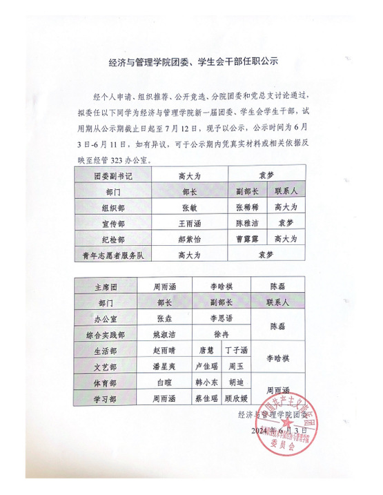 本次换届大会为经管院学生组织注入了新鲜血液,希望新一届的团委、学生会成员能够砥砺深耕、担当责任,以饱满的热情投入到经管院的学生组织工作。