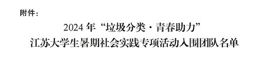 根据《关于开展“垃圾分类·青春助力”江苏大学生暑期社会实践专项活动的通知》相关要求,经团委推荐,团省委社会联络部(志工部)对各团队申报材料进行了综合评审,确定 “绘分类 靓凤城”青春助力垃圾分类志愿服务队入围 2024 年“垃圾分类·青春助力” 江苏大学生暑期社会实践专项活动。